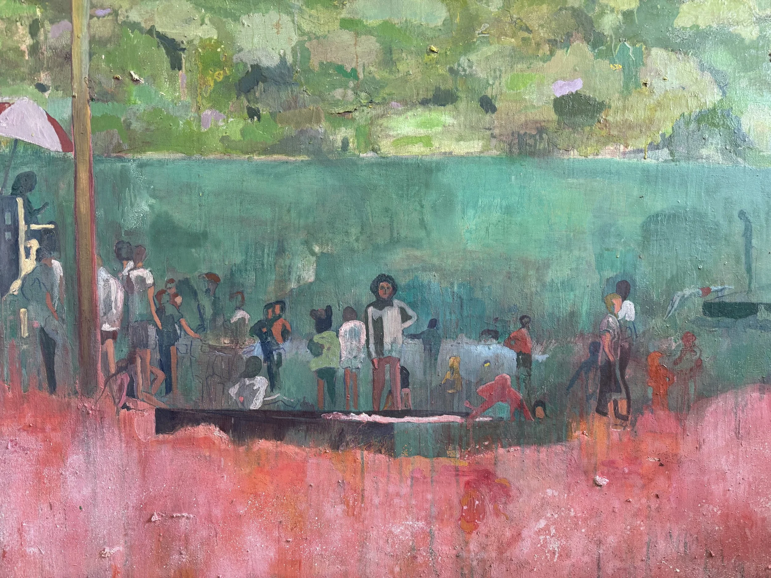 • "At the Dock" (2025), oil on canvas, fleshy sky with sulfuric greens/ochres, textured surface, by Ben Schlidt.