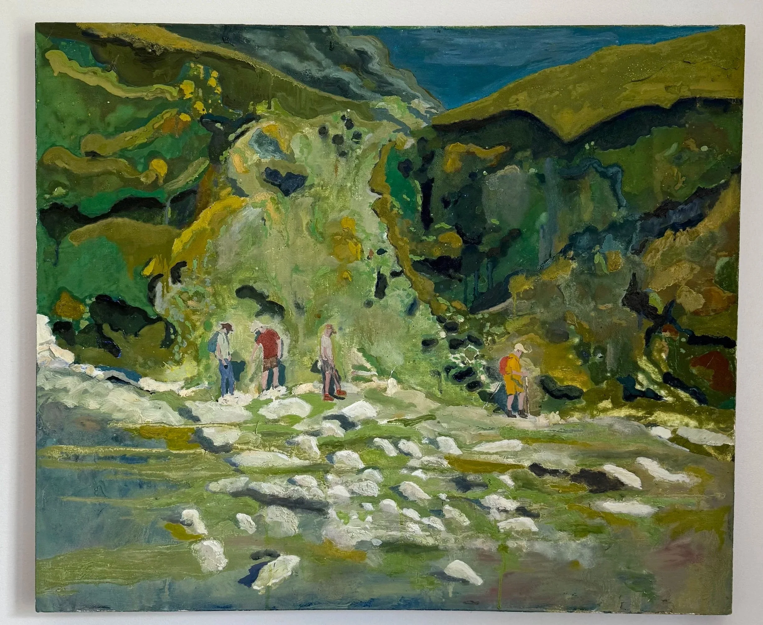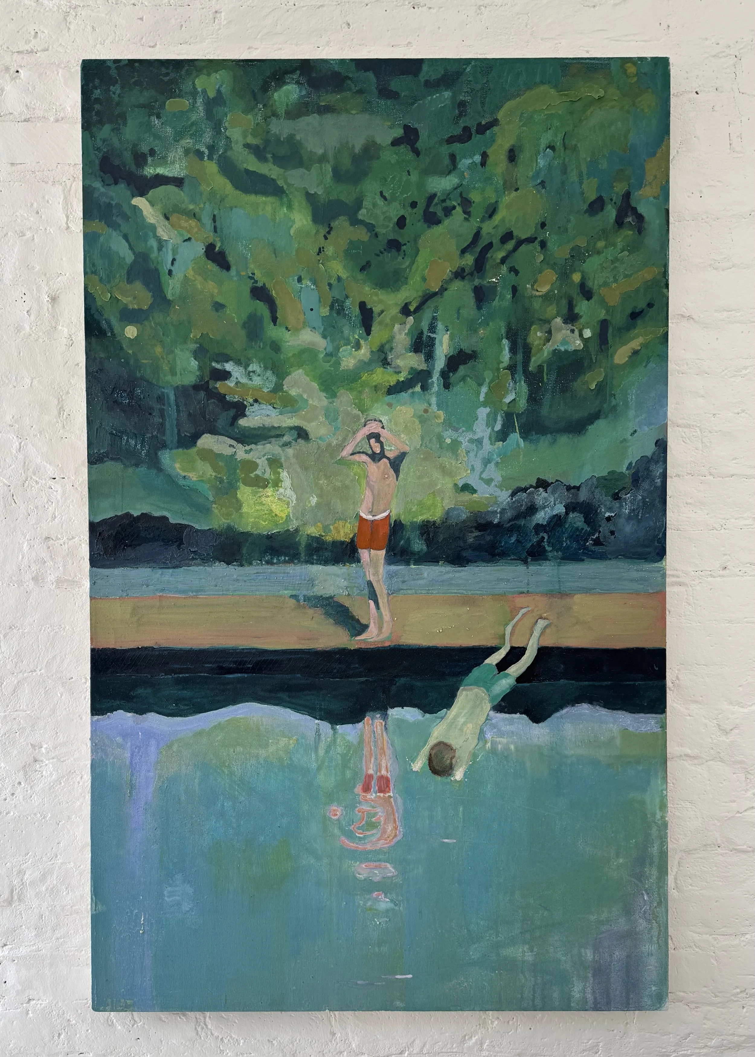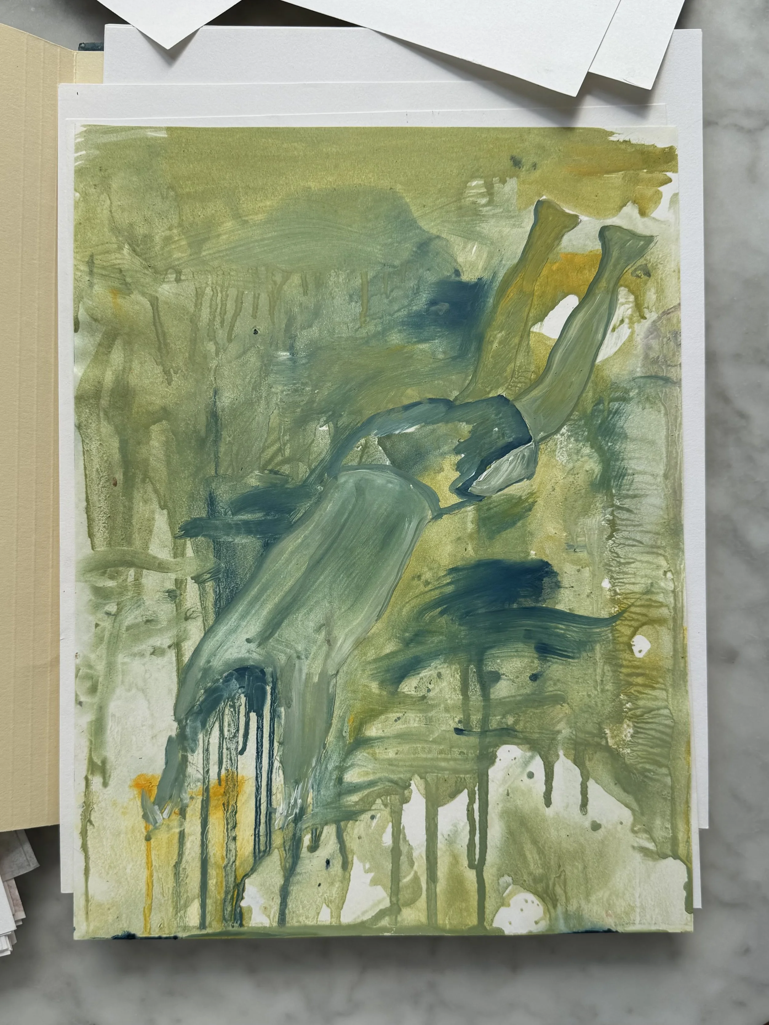 • "Dibble Dabble" (2025), oil and distemper on canvas, dreamlike figure in greens/blues, textured surface, by Ben Schlidt.