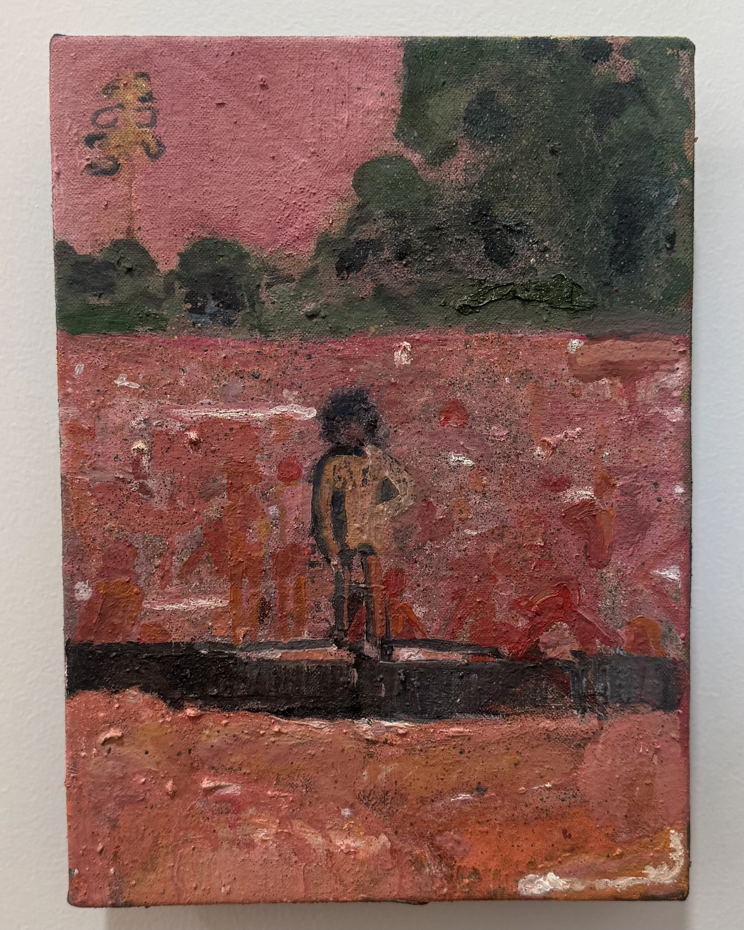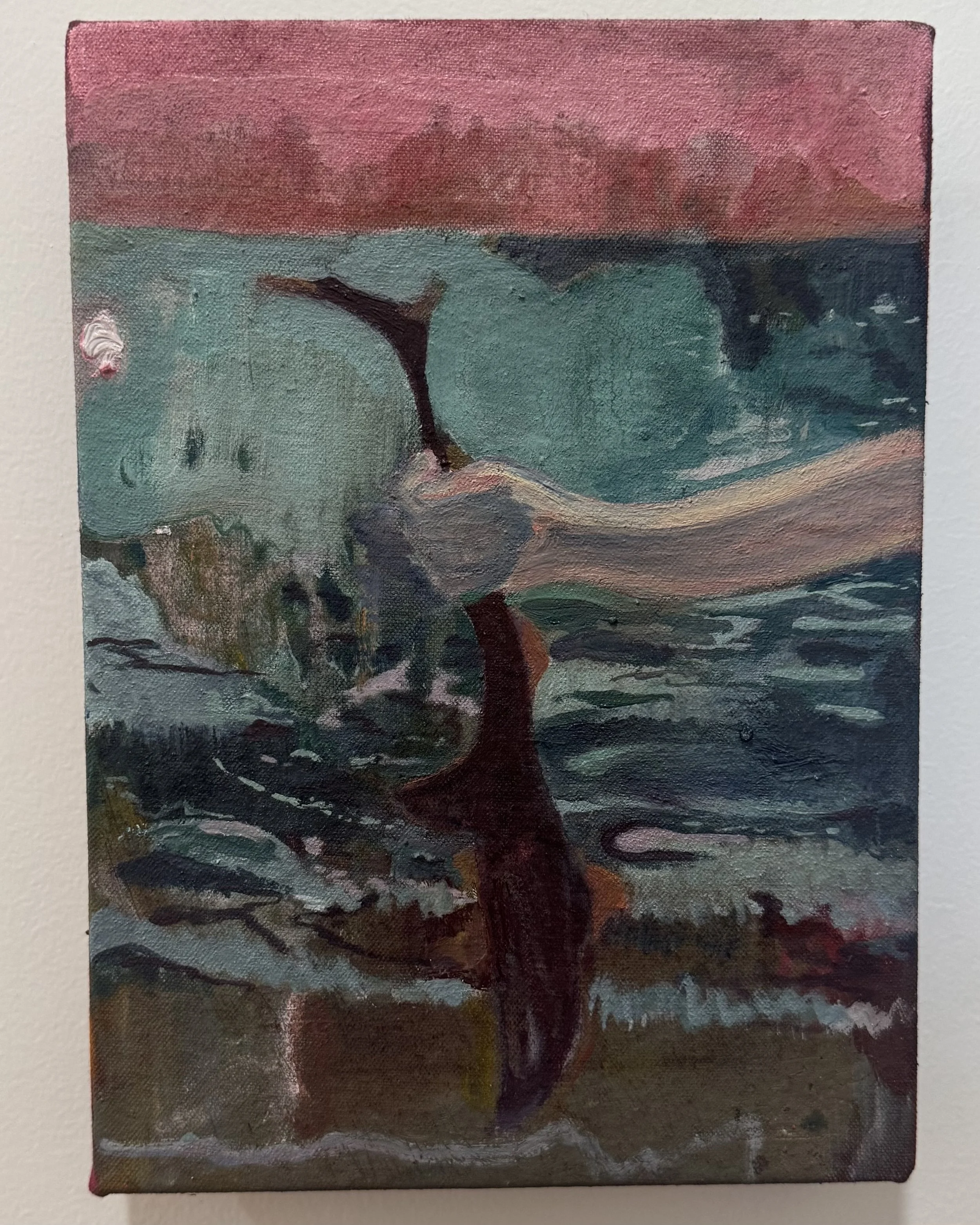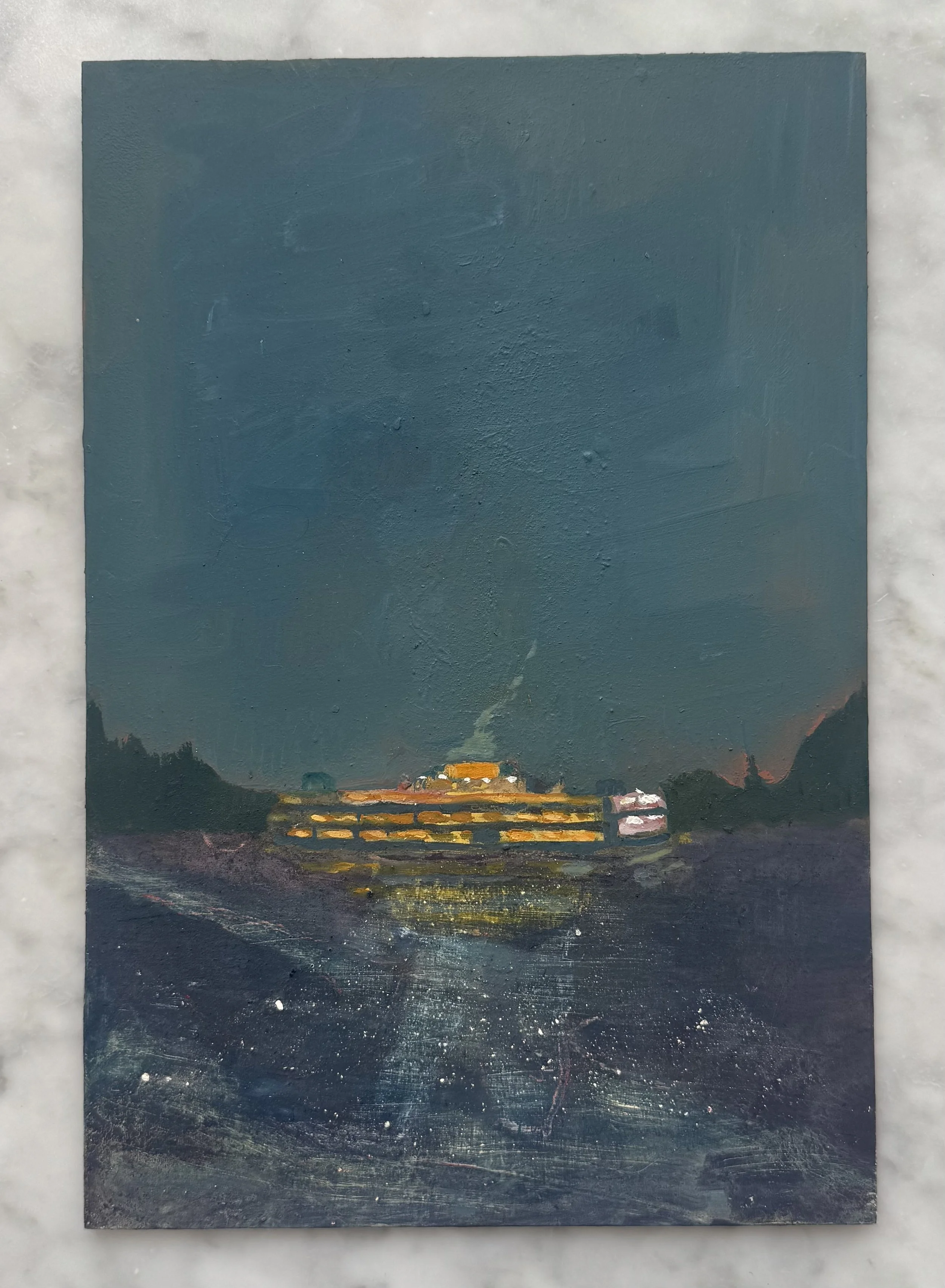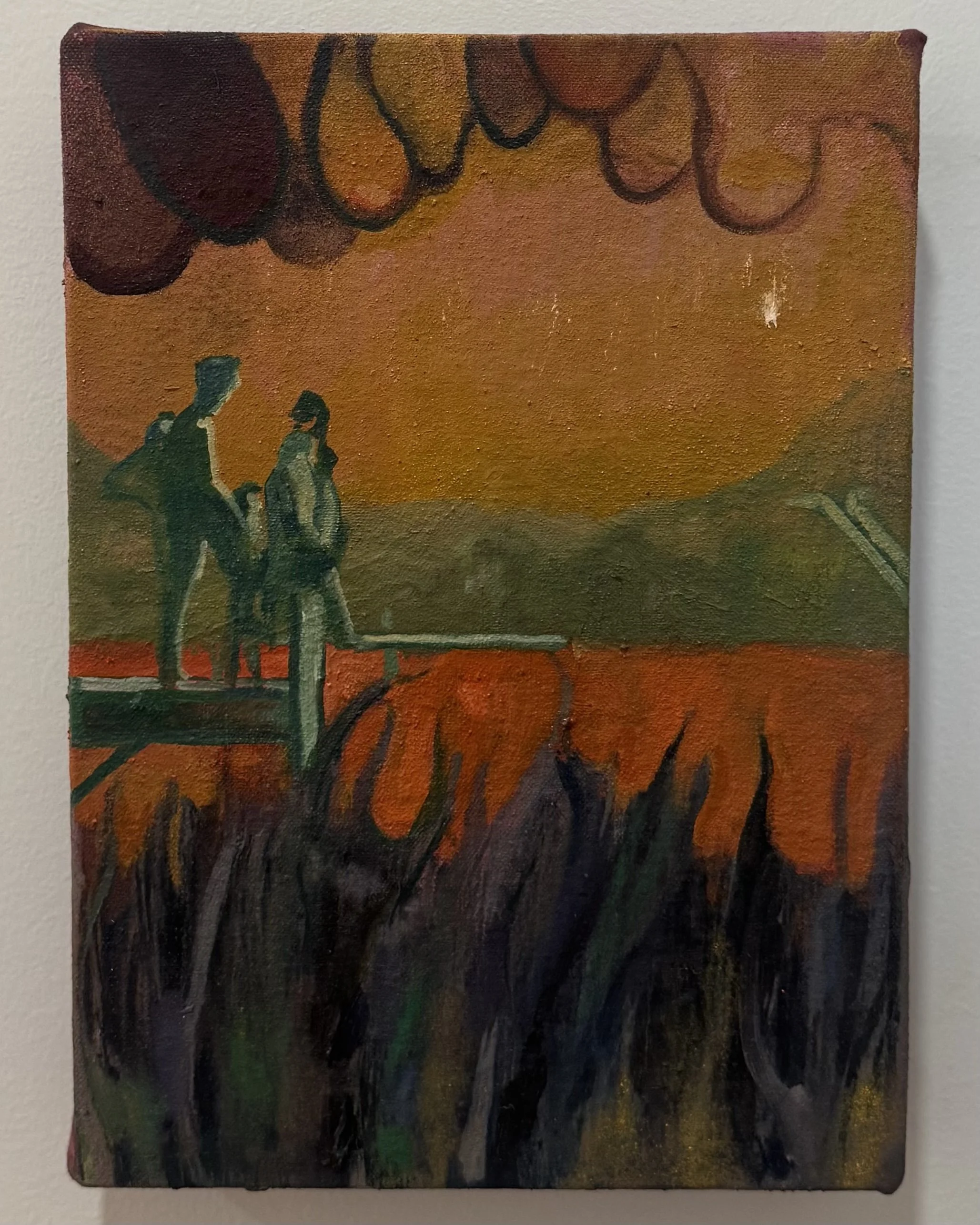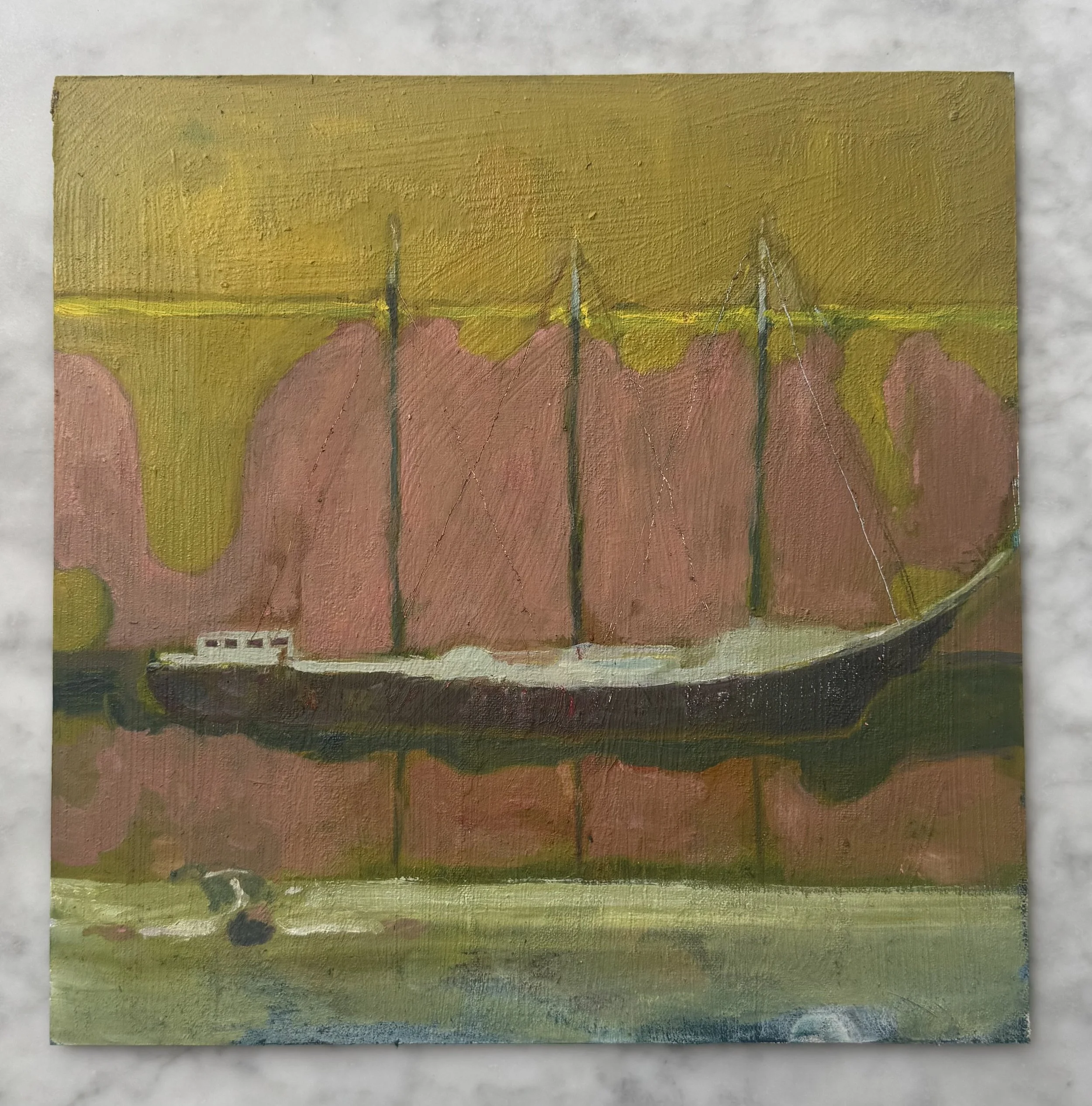 • "At the Dock" (2025), oil on canvas, fleshy sky with sulfuric greens/ochres, textured surface, by Ben Schlidt.