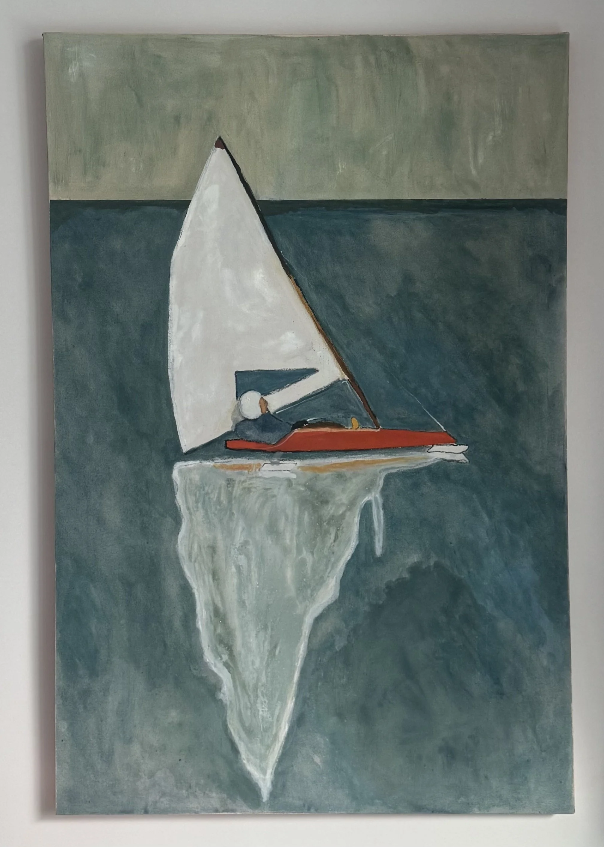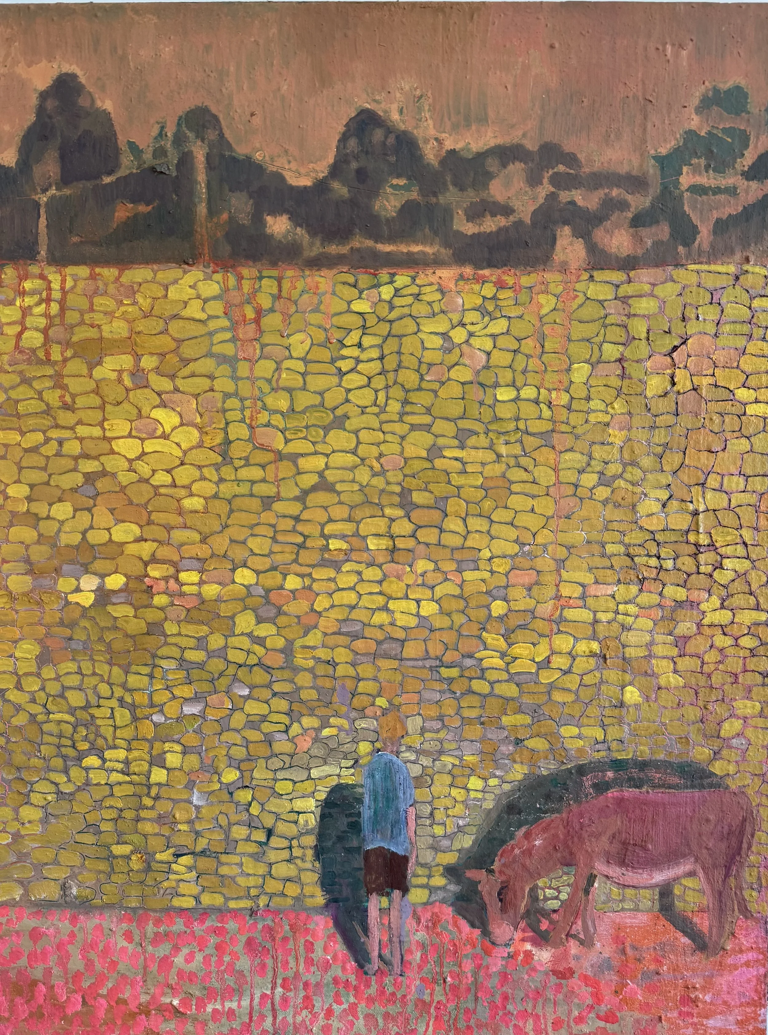 • "Memory of Sister" (2024), oil on canvas, dreamlike Oranges and Blue, Contrasty surface, by Ben Schlidt.